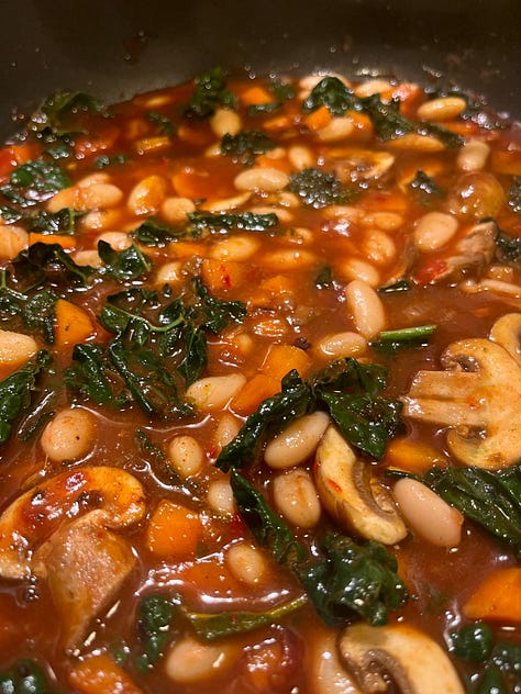 Fennel seeds, cumin, paprika, Aleppo pepper, coconut oil. Heat, fry but lightly. Red onion and parsley, stir. Carrots, cavolo nero, chestnut mushrooms, swirl, cook. Stir in some boiling water, melt a mushroom stock cube, and stir in a generous tablespoon of tomato purée and one teaspoon of rose harissa. Simmer until the mixture thickens. With a wooden spoon, dig a crater in the centre, crack an egg and cover the casserole. Reduce the heat, simmer until the egg is cooked to your taste. Grind some black pepper, yolky.