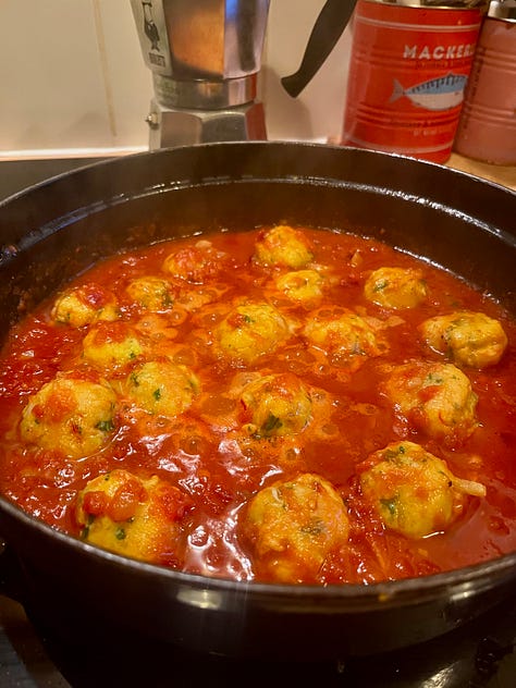 Once you are happy with the consistence and texture of the tomato sauce, add the fish balls to the tomato sauce. Reduce the heat to a simmer and cook, moving the balls around occasionally. Serve hot.