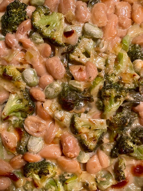 in a casserole (that is suitable for the oven), soften some leek with the oil from an anchovies’ tin. Add some sage (chopped) and garlic (grated), plus ½ teaspoon of chilli powder and 1 teaspoon of fennel seeds. Cook gently. Add the juice from half an orange and the anchovies, stirring with a wooden spoon until the filets are reduced to a paste. Add the broccoli and broad beans, swirl and cook for five minutes or so, still gently. Reduce the heat. Add the butter beans + their water, as well as a generous gulp of oat cream. Simmer for a good ten minutes, or until the mixture will have thickened. Add some parmesan, swirl and pre-heat the oven to 180C. Roast until it’s bubbling. You may want to switch to grill for the last three-four-or-so minutes.